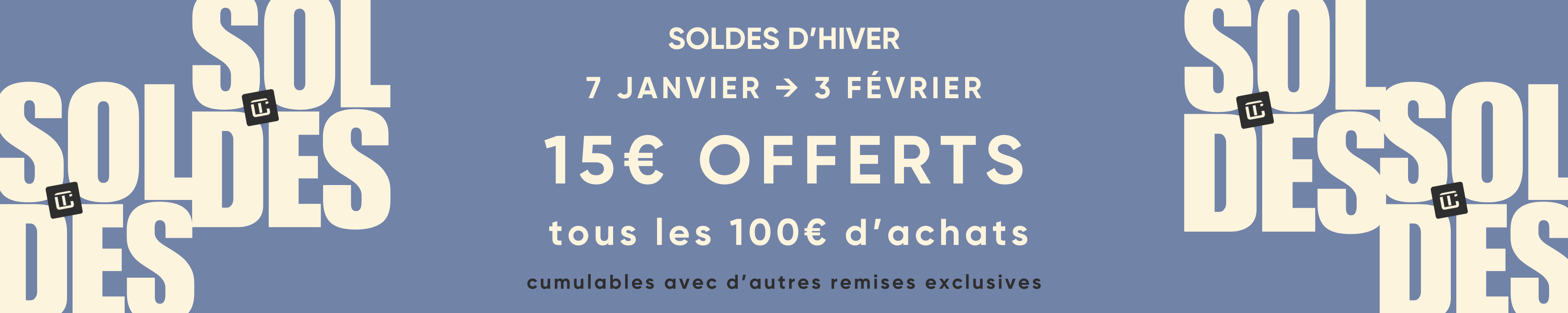 SOLDES D'HIVER du 7 Janvier au 3 Février inclus : 15€ offerts tous les 100€ d'achats hors frais de port + des remises jusqu'à -50%