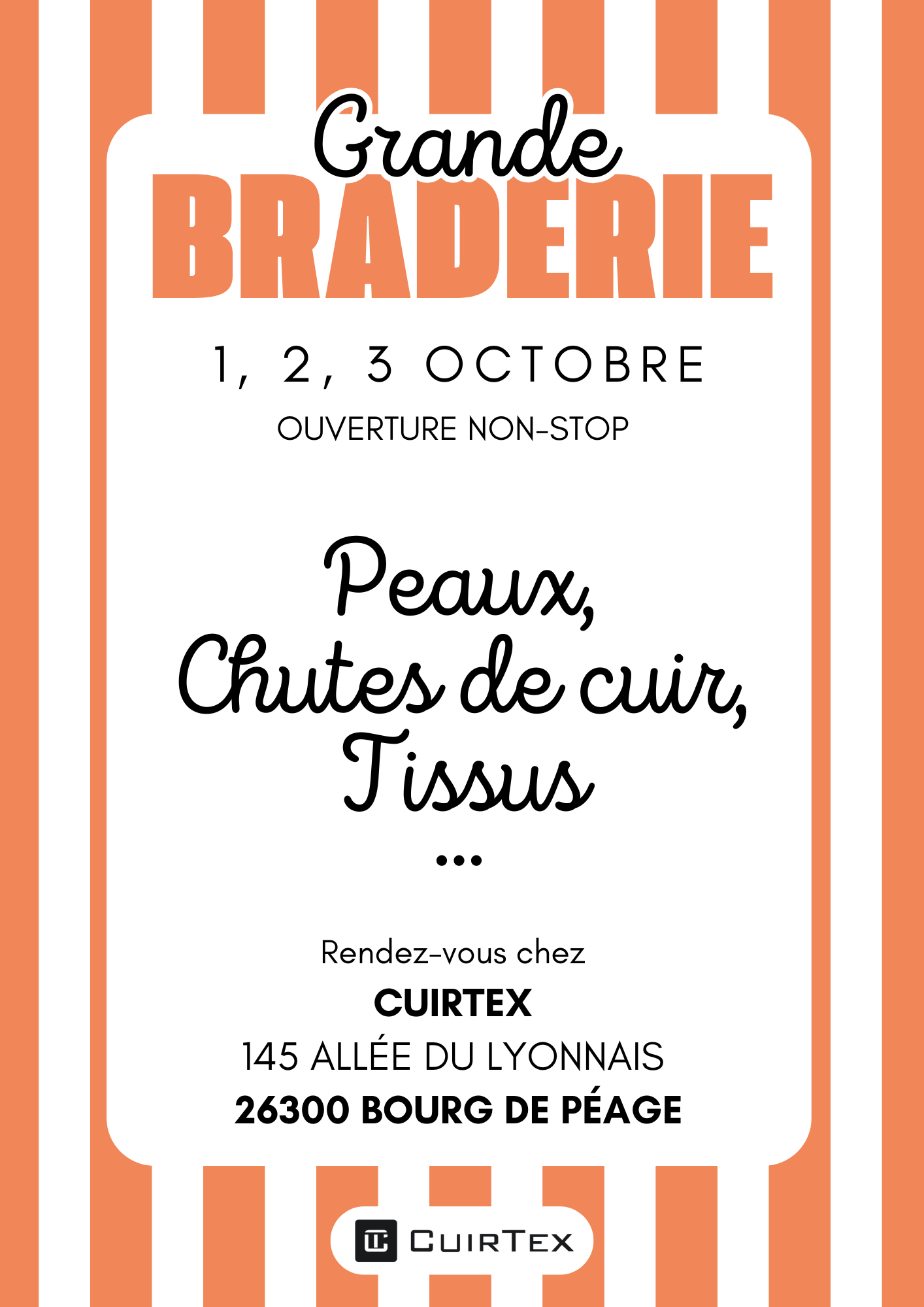 Nous vous donnons rendez-vous en magasin le 1, 2 & 3 Octobre pour profiter de notre Grande Braderie de fin d'année sur une sélection de peaux, chutes de cuir et tissus à prix cassés.