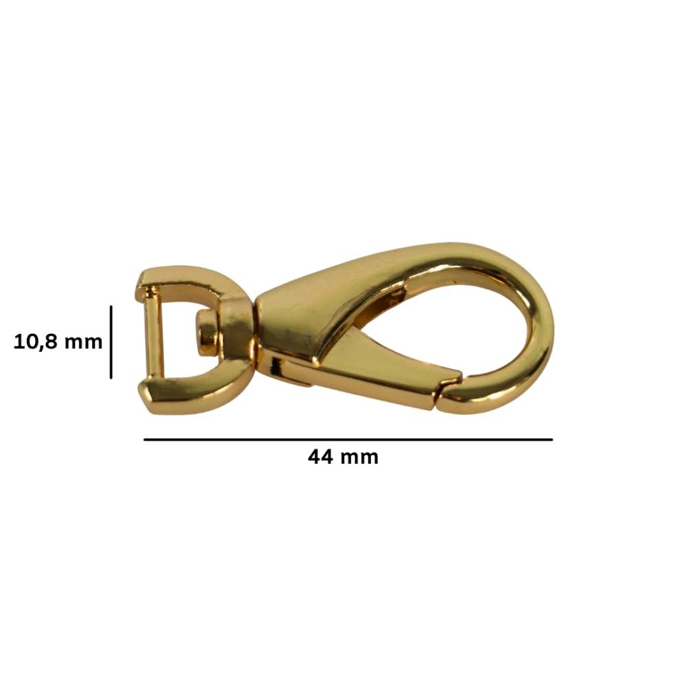 Petit mousqueton métallique doré à ressort, idéal pour personnaliser vos sacs à main ou pochettes avec élégance.