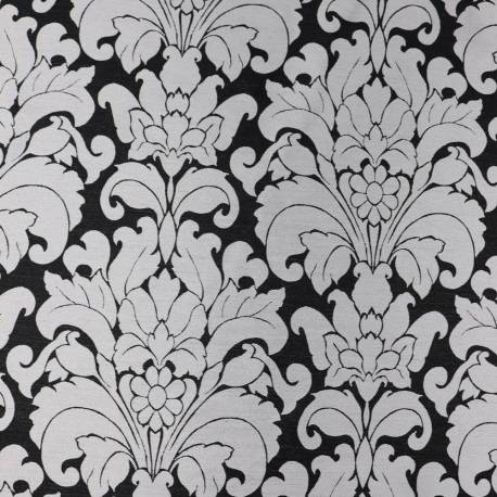 Tissu d'ameublement noir et blanc à motifs au style baroque, pouvant être utilisé pour la confection d'objets déco, de rideaux, ou bien en loisirs créatifs.